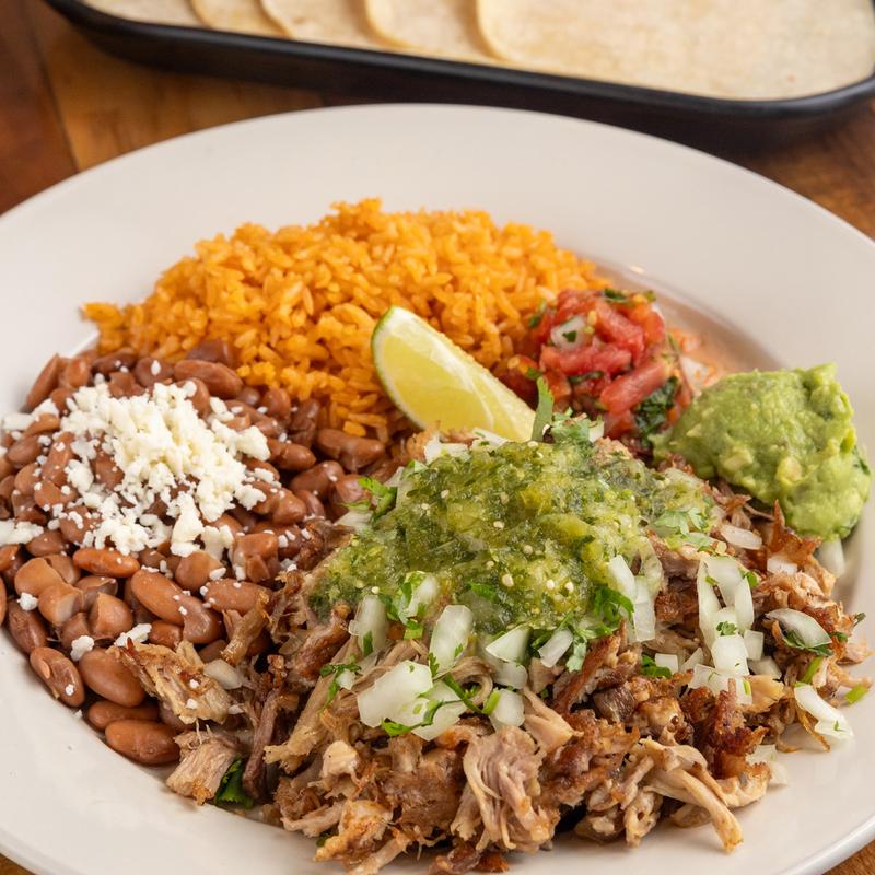 A plate of pork carnitas topped with fresh onions and cilantro, pico de gallo, guacamole, and hot or mild salsa. Served with corn tortillas and a side of rice and beans