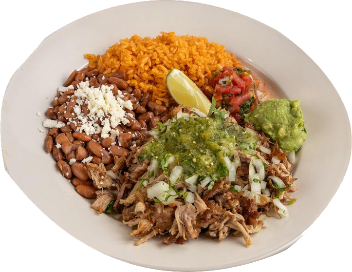 A plate of pork carnitas topped with fresh onions and cilantro, pico de gallo, guacamole, and hot or mild salsa. Served with corn tortillas and a side of rice and beans